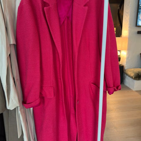 Zara kåpe for dame i størrelse M. Kåpen er brun og laget av polyester. Modellen har enkel, rett fasong med krage og åpen front uten synlige knapper. Lengden går omtrent til over kneet, avhengig av høyde. Passer som ytterplagg i overgangssesonger eller milde vinterdager.