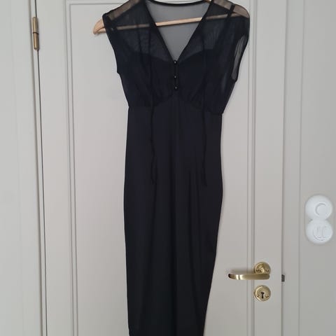 Zara festkjole i lilla polyester for dame i størrelse S. Kjolen har dyp V-utringning, markert midje og lange ermer med brede mansjetter og dekorative knapper. Stoffet er lett gjennomsiktig med strukturert prikkemønster. Glidelås i ryggen for lukking. Egnet som penkjole til fest og andre anledninger.