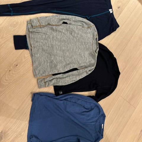 Klespakke med 4 ullgensere (Vikafjell, Pierre Robert, safa osv) 1 svart longs og 1 superundertøy polyester genser. unisex. størrelse 164. 14 år. Flere plagg i ulike flerfargede kombinasjoner, med langermede overdeler og lange underdeler. Plaggene er i merinoull (merket 158/164 eller 14 år på lappen) som egner seg til bruk som innerste lag til hverdags, utelek og aktiviteter. Passer til barn rundt størrelse 164 som trenger varmt og funksjonelt ullundertøy.