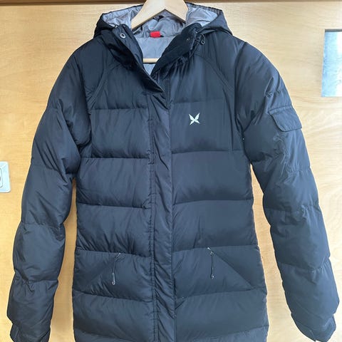 Kåpen er svart med hette og høy hals som gir god beskyttelse mot kulda. Den er fylt med dun, 80/20 se lapp på bilde. Lengden på kåpen er til midt på låret, avhengig av hvor høy du er. Kåpen har glidelås foran med klaff og borrelås for å holde klaffen lukket. Gode, dype sidelommer, elastiske mansjetter og en innerlomme med glidelås.