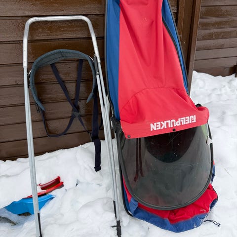 Godt brukt barnepulk i rød og grå farge selges!