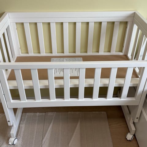 Bedside Crib Two er en smart liten seng med tre funksjoner i ett og samme møbler. Bruk frittstående som en vanlig baby seng, eller brett ned langsiden og plasser nær din egen seng for trygg søvn med babyen din hele natten. Høyden på sengen kan enkelt justeres i 12 forskjellige stillinger fra 38,5 cm til 56 cm (uten hjul og uten madrass)for å passe til foreldrene sin seng. Når barnetiden er over, kan sengen brukes som en liten barnesofa. Finnes i hvitt lakkert bjørk.