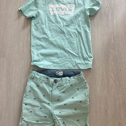 H&M t-skjorte for gutt i størrelse 116. T-skjorten er flerfarget med motiv av dinosaurer på fronten. Passer til barn rundt 5–6 år, avhengig av høyde. Materialet er lett og egnet til hverdagsbruk, barnehage eller skole. Kun t-skjorten fra H&M er inkludert; shortsen på bildet er fra et annet merke.