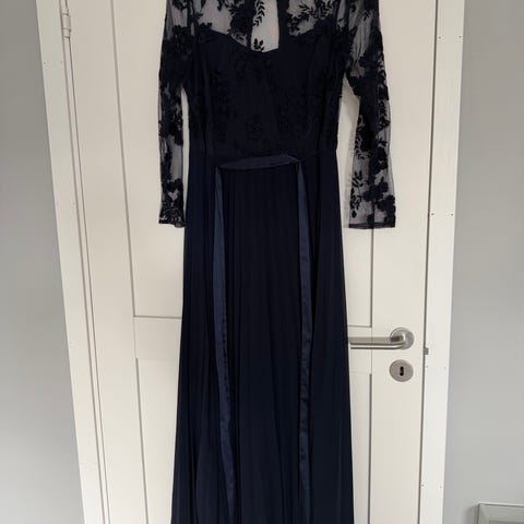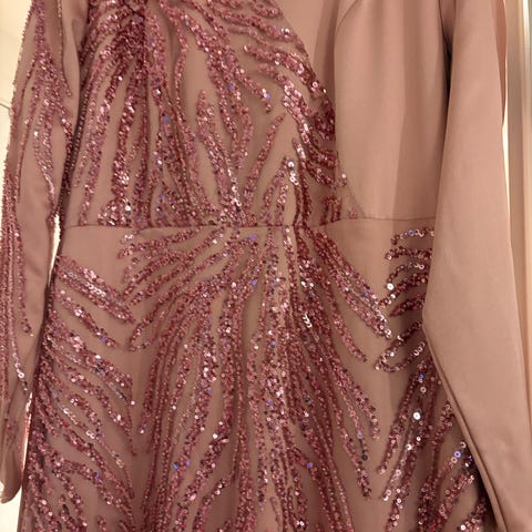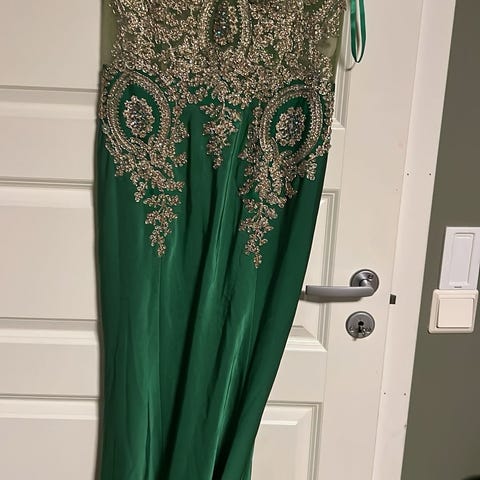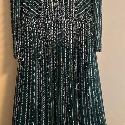 kjole til spesiell anledning i størrelse L. Lang modell med lange ermer. Kjolen er grønn og laget i chiffon. Front og bakside har partier med paljetter som gir et markert uttrykk. Passer til formelle anledninger som selskap, bryllup eller andre festlige sammenkomster.