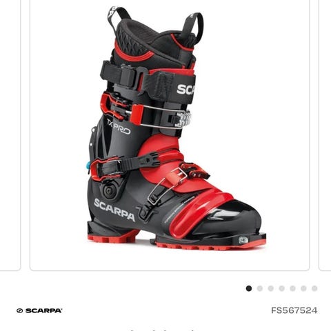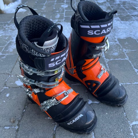 Scarpa TX comp i gul og svart farge. Støvlene har fire spenner og powerstrap øverst for god justering rundt leggen. De har gå- og kjøremodus. Overdelen er i plast med innerstøvel som gir støtte og isolasjon. Passer til bruk med NTN-binding.