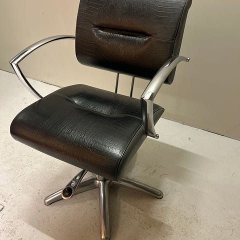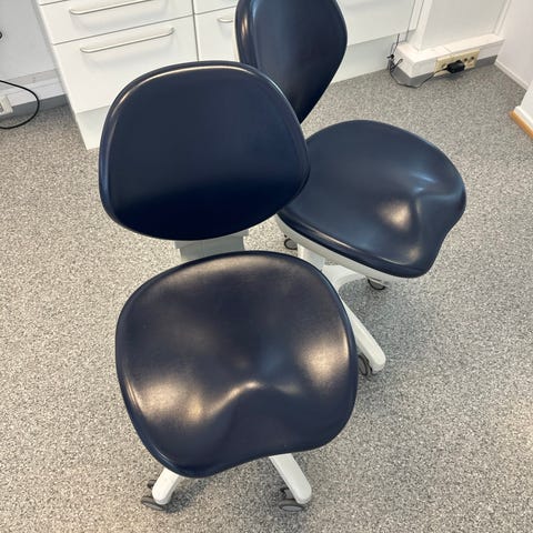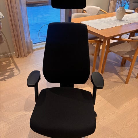 Kontorstol/arbeidsstol med rund setepute og lav ryggstøtte. Stolen har hjul, og fotring nederst. Samt justerbar høyde med gasslift, som styres ved å trykke på metallplaten nederst på stolen. Understell i metall med fem hjul for enkel forflytning. Egnet som arbeidsstol ved skrivebord eller arbeidsbenk. Det er synlig slitasje på setet og noe slitasje på ryggstøtten, som vist på bildene.