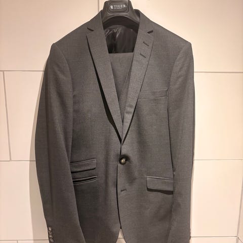 Tiger of Sweden dress for herre i størrelse 48 i bukse og 50 i dressjakke. Dressen består av dressjakke og dressbukse i grønn ull-polyester blanding. Klassisk snitt med jakkeslag, lommer med klaff og matchende bukse med press. Ikke skreddersydd.