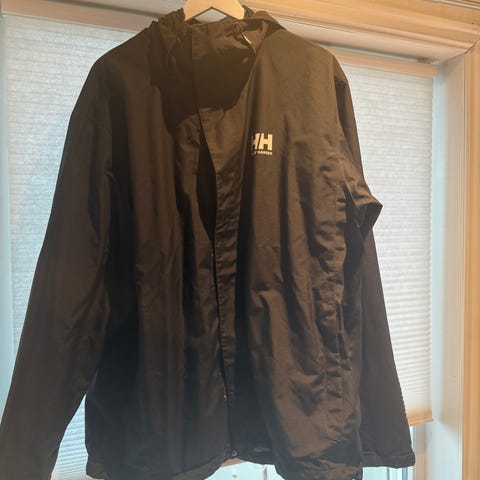 Nesten ubrukt Helly Hansen regnjakke i str. XL. Den har hette, glidelåslukking foran og sidelommer. Innsiden har nettingfôr for bedre komfort. Vindtett, vanntett og pustende. Egnet som regntøy til hverdagsbruk og tur.