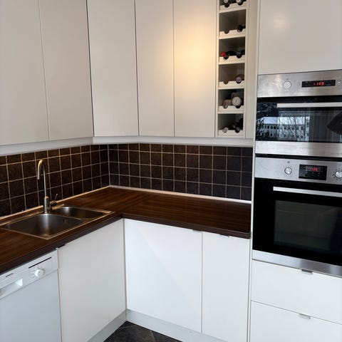 IKEA kjøkkeninnredning hvit med benkeplate, vask, koketopp og stekeovn