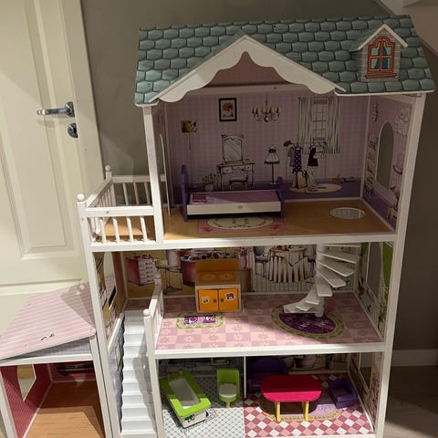 Pent brukte drømmehus med møbler, bil, en barbie og en god del tilbehør, vises på bilder, selges samlet for 1 000 kr. Lyd og lys funker som det skal. Må hentes.