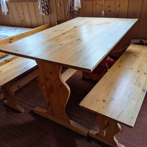 Spisestue / kjøkkenbord med 4 stoler i kombinasjon av tre og metall. Bordplate og stolseter er i brunbeiset treverk, mens understell og stolrammer er i svart metall.