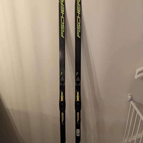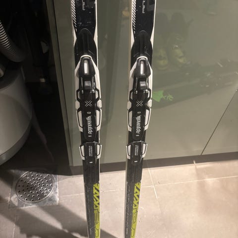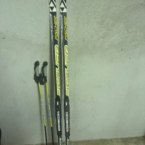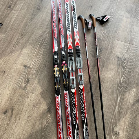 Skiene er godt brukt, men fungerer fint for barn som vil teste skøyting. Stavene er 115 cm