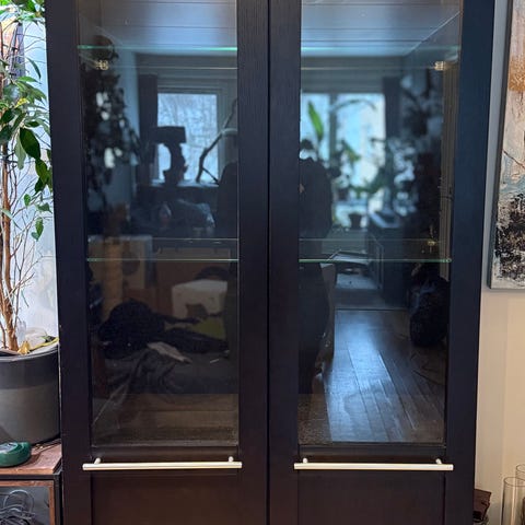 2 stk vitrineskap selges samlet , fint å ha de helt sammen eller ha litt avstand mellom de , de er hele å fine noe merker er det på det. Spotter i begge skap