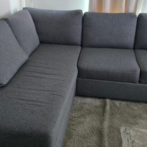 Denne sofaen er en del av et seksjonssofasett. Derfor er stoffsømmen synlig nederst til høyre. Dette er for å beskytte sofahjørnene mot slitasje. Hvis du ikke har noe imot dette, er det et klokt valg å velge dette sofasettet. Sofaen har en moderat fasthet og er fri for flekker. Den er vanligvis beskyttet av et sofatrekk. 80*200 cm