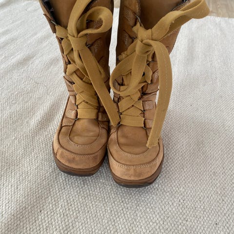 Timberland vinterstøvler for jente i størrelse 32. Høye støvler i brunt skinn med snøring foran og myk polstring øverst på skaftet. Modellen er merket som vanntett (waterproof). Såle i gummi for godt grep. Passer som varme og beskyttende vintersko til barn.