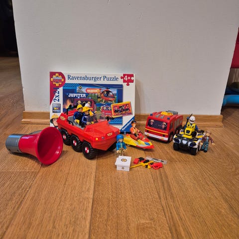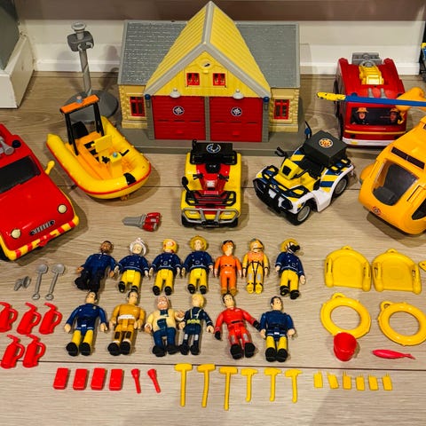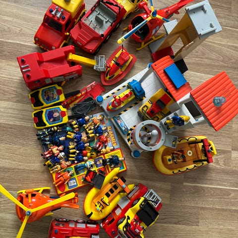 Selger en stor pakke med Brannmann Sam. Lekene er godt brukt, og noen små mangler vil forekomme. Eksempelvis mangler brannbilen en dør, helikopteret har en knekt del på sin høyre side og den elektronikken på den minste brannbilen fungerer ikke. Men her er det uansett mye god lekeverdi igjen.