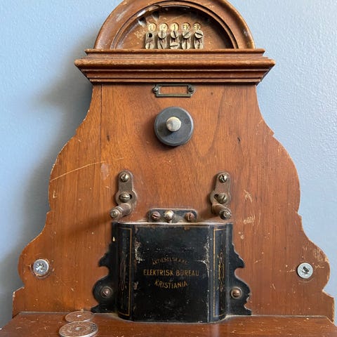 Waterbury Clock Co veggklokke med kasse i tre og urverk i messing. Klokken har rektangulær treramme med glass i front som viser tannhjul og mekanikk. Innvendig er det original trykket etikett fra Waterbury Clock Co, Waterbury, Conn., som beskriver «Brass Clocks & Time Pieces» og natt- og dagverk. Mekanisk opptrekksverk med fjær og pendeloppheng. Egnet som samlerobjekt eller dekorativ veggklokke for den som er interessert i eldre mekaniske klokker og restaurering.kom m bud