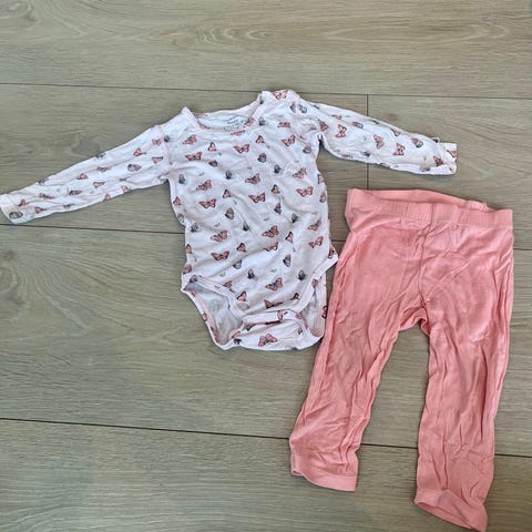 Sett Body og bukse str 68. Fant en flekk på armen på bodyen. Ser ikke vekk fra at jeg kan ha oversett noe mer. Derfor billig