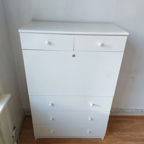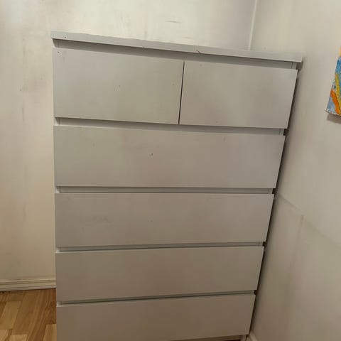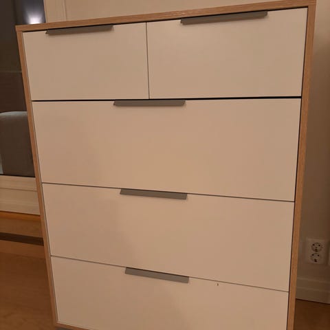 Selger en hvit kommode med fire skuffer. Skuffene glir lett. Kommoden er litt shaky, men tror det bare er å fikse et par spikre ekstra i bakveggen. Må hentes.