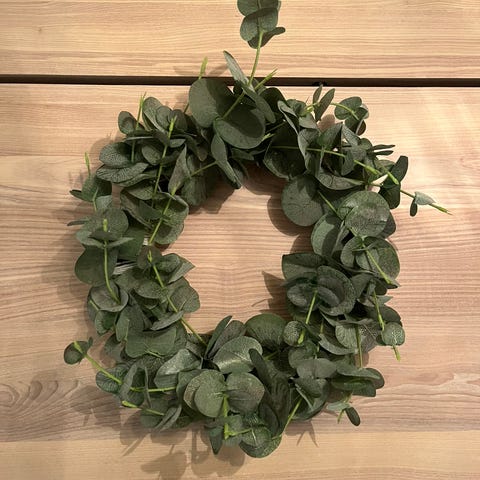 Fin og grønn dørkrans fra Etsy av kunstig eucalyptus og lamb's ear blader, kvistene er ekte. Ser pen ut på ytterdøren eller som pynt på hytta.