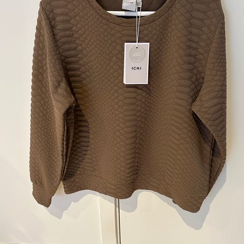 Genseren har litt puff-ermer som gir genseren en ekstra detalj. Materialet er i mohair- og ullblanding. Genseren er kun brukt ett par ganger, så den fremstår som ny.