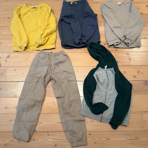 Liten pakke med cargobukse med regulerbar strikk i livet og to gensere i myk og god stand.