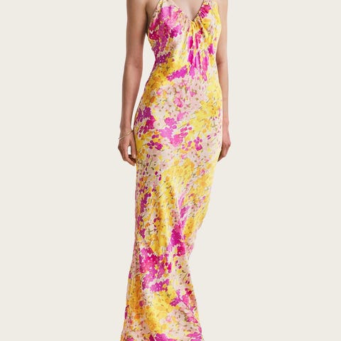 sommerkjole i sateng, størrelse S. Kjolen er flerfarget med et blomsterinspirert mønster i hovedsak rosa toner. Modellen er ermeløs med tynne stropper og har en kroppsnær passform som faller til midt på leggen. Stoffet har en glatt og blank overflate typisk for sateng. Egner seg godt til bruk på varme dager, ferie og ulike anledninger der en lett sommerkjole passer.