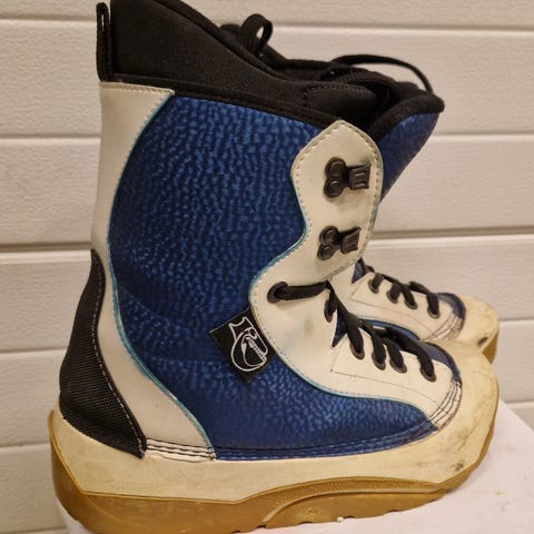 Snowboardstøvler størrelse 39 i blå og hvit farge med sort snøring og lys brun yttersåle. Overdelen er støv i syntetisk materiale, og har høy skaft for god støtte rundt ankel. Sålen har grovt mønster for bedre grep på snø og is.