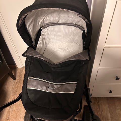 Emmaljunga barnevogn med liggedel i grå tekstil. Vognen har justerbart håndtak og fire hjul med god fjæring, egnet for bruk på både asfalt og grusvei. Understellet har oppbevaringskurv under liggedelen.