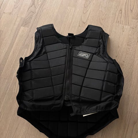 Ridehjelp sikkerhetsvest for barn i størrelse 12 i svart farge. Vesten har glidelåslukking foran og polstrede paneler foran og bak for støtdemping og beskyttelse ved ridning. Justerbare partier rundt skuldre og sider gir mulighet for tilpasning til barnet. Egnet som sikkerhetsvest til bruk ved ridning og annen hestesport der ekstra beskyttelse ønskes.