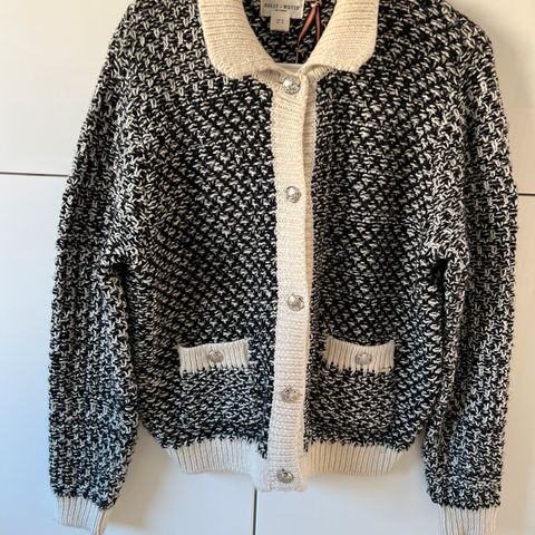 Jakke for dame i størrelse M. Jakken er svart med lyst rutemønster og har dekorative knapper i front. Kragen er ensfarget svart med perledetaljer langs kanten. Modellen har to frontlommer og ribbestrikkede kanter nederst og ved ermene. Passer som en lett jakke eller som en tykk cardigan over annet tøy.
