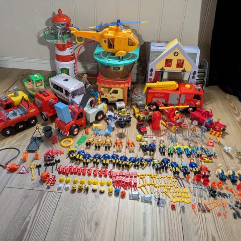 Selger en stor pakke med Brannmann Sam. Feil og mangler vil forekomme. F.eks. mangler helikopteret en dør, den gule brannbilen har knekt et sidespeil og ellers noe slitasje på overflatene. Men her er det mye god lekeverdi igjen.