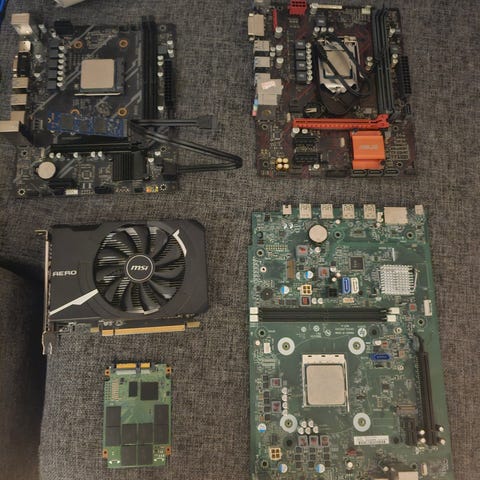 Diverse PC-komponenter i én pakke. Bildene viser blant annet flere hovedkort, ulike skjermkort, RAM-minnebrikker, prosessorer med kjølere, strømforsyning og diverse kabler og smådeler.