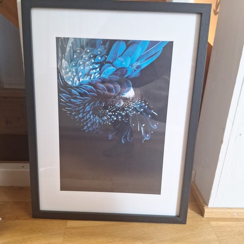 Bildet måler 68 x 41 cm og leveres ferdig innrammet med passepartout og mørk ramme.
