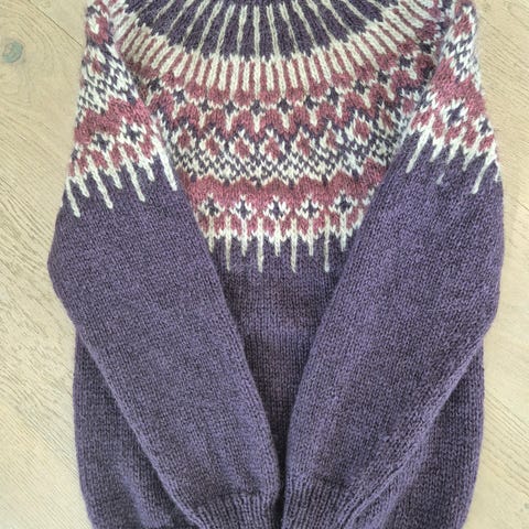 1 stk FØYKA lyngfarger i str M ferdig strikket i kombinasjonen Blåne pelsullgarn fra Hillesvåg og Alafosslopi fra Island.