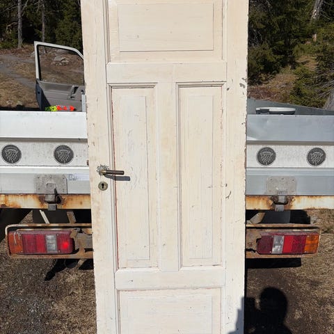 Kommer uten dørkarm. Har hengsler men mangler et dørhåndtak på den ene siden. Panelene er også malt blå på den ene siden (se bilder), Egnet som innerdør. Døren er 200x86 cm.