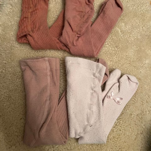 Pakke med 6 strømpebukser i str 62/68 ( en uten lapp, men brukt som str 62/68). 3 fra Newbie, en fra hm, en fra Cubus og en fra ukjent merke da lappen er borte. De har nupper og 2 av de har løs tråd, men ikke hull (se bilde). Opplever newbie sine som litt løse i stoff bak på rumpa og kan virke litt gjennomsiktig under bruk. Spesielt de 2 uten rysjer