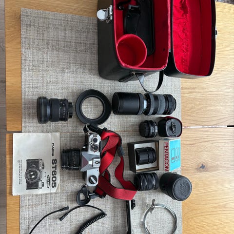 Fujifilm Fujica ST701 analogt speilreflekskamera med utskiftbar M42-objektivfatning. Kameraet bruker 35 mm film og har manuelle innstillinger for lukker og eksponering. Huset er i metall med sort skinnimitasjon og optisk søker på baksiden.