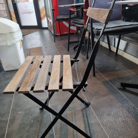 Stol i svart metall med polstret sete. Ryggstøtten har perforert metallplate i trekantform som gir lufting og støtte. Setet er trukket i svart materiale, trolig kunstskinn eller lignende. Egnet som ekstra stol i hjem, møterom, kantine eller lignende bruksområder der det er behov for en enkel og funksjonell sitteplass.