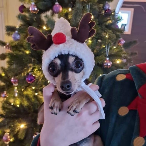 Selger en lue til mellomstor hund. Ca. 11cm, med hull til ørene.