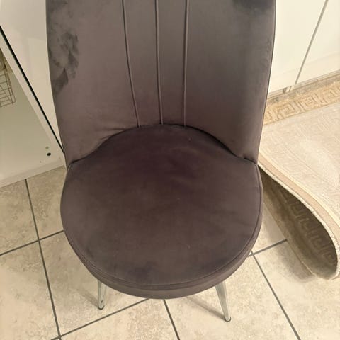 Stol i svart metall med polstret sete. Ryggstøtten har perforert metallplate i trekantform som gir lufting og støtte. Setet er trukket i svart materiale, trolig kunstskinn eller lignende. Egnet som ekstra stol i hjem, møterom, kantine eller lignende bruksområder der det er behov for en enkel og funksjonell sitteplass.