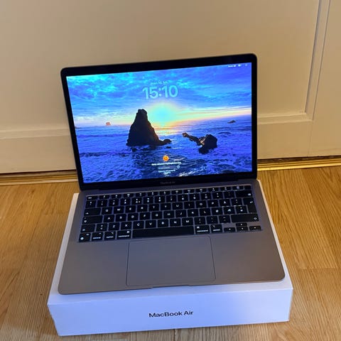Selger en MacBook Air M1 (2020-modell) i space grey. Rask, stillegående og svært stabil maskin – perfekt til studier, jobb, surfing og streaming.