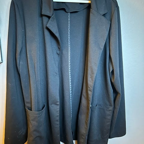 Primark blazer for dame i størrelse 44. Blazeren er svart og laget i chiffon. Modellen har enkel, åpen front uten synlige knapper og lange ermer. Passer til bruk over bluser, topper eller kjoler, både til hverdags og mer formelle anledninger.