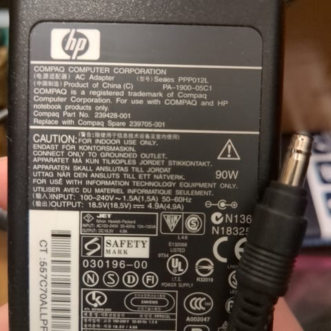 Strømadapter for HP bærbar PC med rund plugg og blå innside. Standard nettledning og adapterhus i svart plast. Egnet som erstatningslader eller ekstra lader for kompatible HP‑modeller. Nøyaktige spesifikasjoner som effekt (W), spenning (V) og strømstyrke (A) bør kontrolleres mot merkingen på adapteren og PC-en for å sikre kompatibilitet.