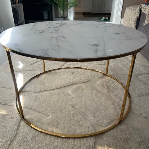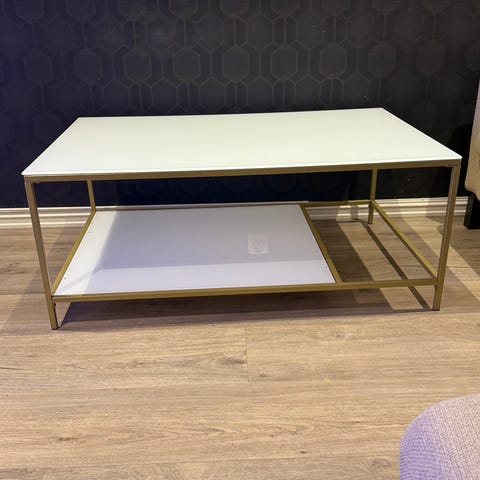 Sofa bord med hvit glassplater og gullrammer.