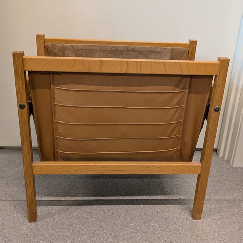 Selger en nydelig og solid retro magasinholder, modell “News”, i palisander og brunt ekte skinn.