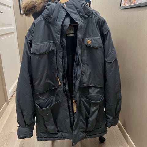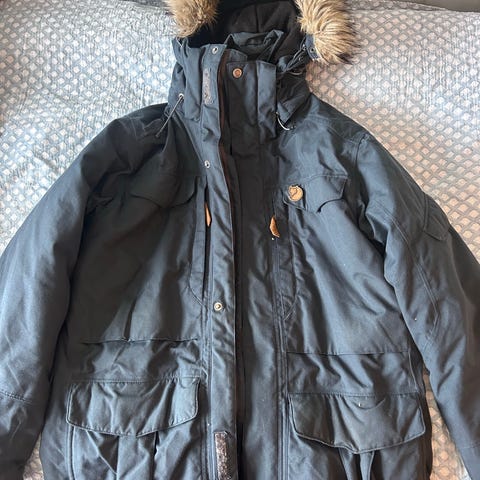 Veldig fin og pent brukt parkas i fra fjällräven. God og varm på de kaldeste dagene, med veldig mange kjekke lommer. Størrelsen tilsvarer nærmere L vil jeg si