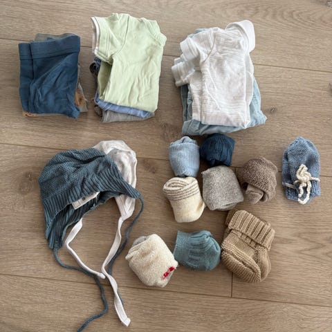 Klespakke med 5 sett med body og bukse, to luer, en hjemmestrikket cardigan, en ullstrømpebukse, 3 par klorevotter og et par Mikke mus sokker.