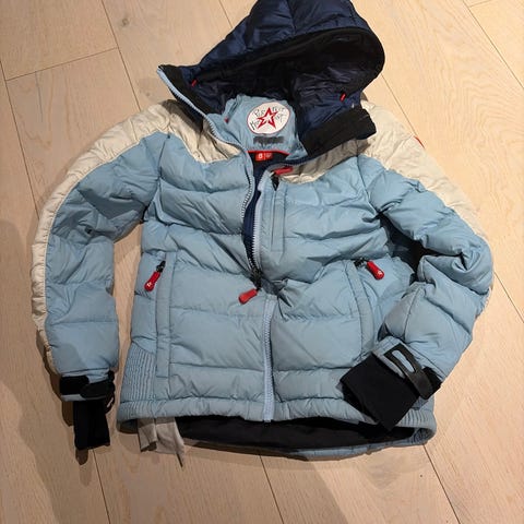 Dunjakke i nydelig blåfarge med herlig stripete fargekombinasjon, (bakkens fineste?) med diverse tekniske detaljer, lommer, sneskjørt mm
