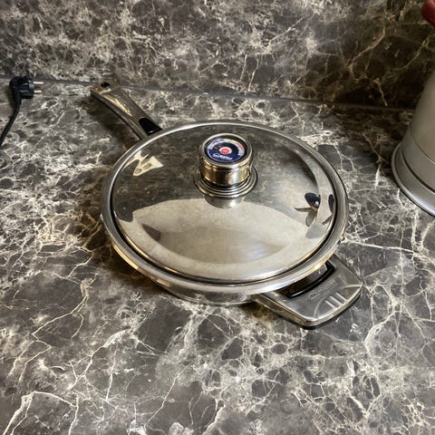 Kasserolle i rustfritt stål med tilhørende glasslokk. Kasserollen har to håndtak i plast eller varmebestandig materiale på sidene, og lokket har håndtak på toppen. Bunnen er i metall med synlige bruksspor. Egnet til koking av for eksempel grønnsaker, pasta eller supper.